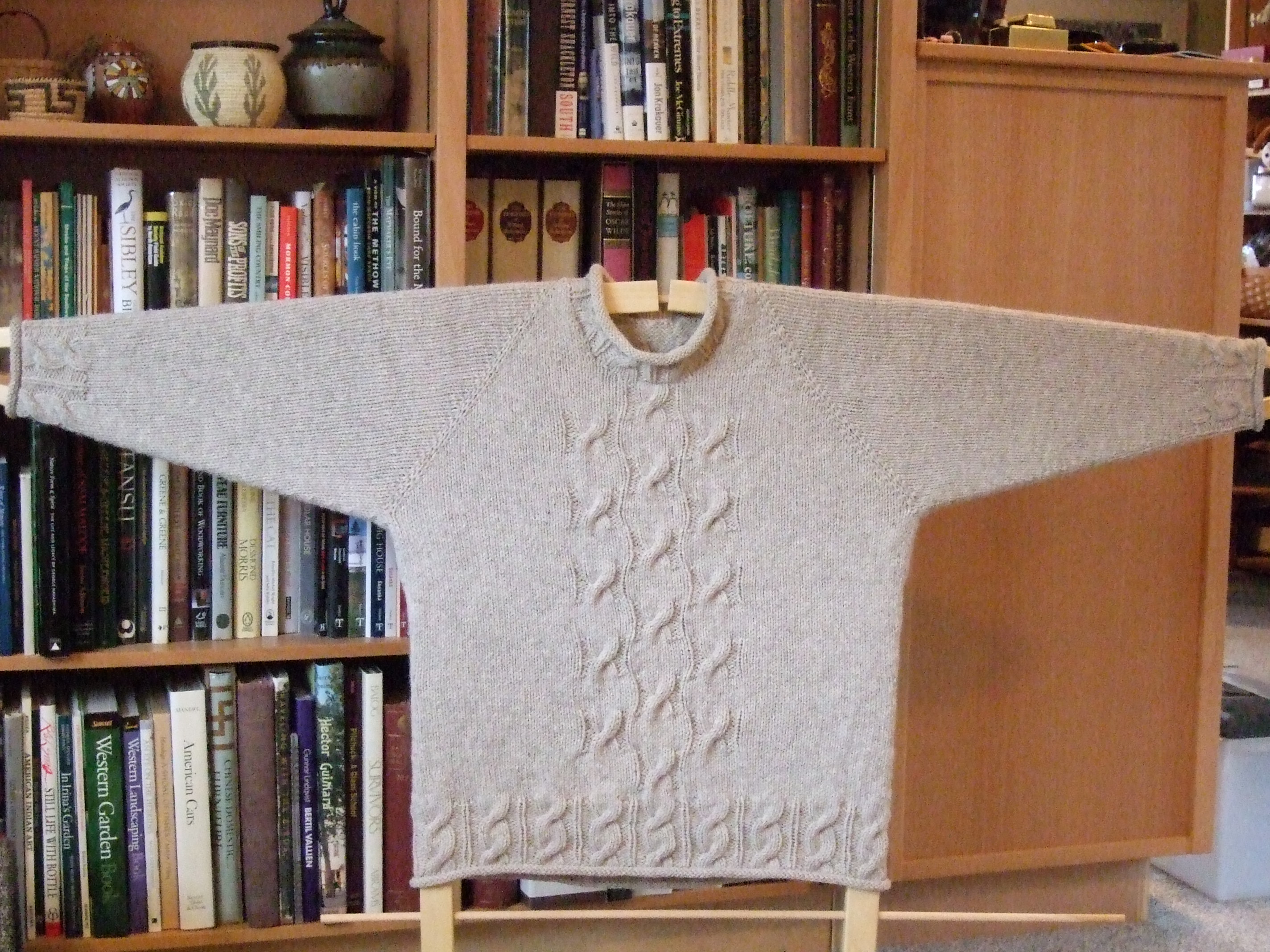 Yarn: Rowan Magpie Tweed, 7 skeins. Needle size 8 (5 mm). The cable panel on the front and back is from “The New Knitting Stitch Library” by Lesley Stanfield (no longer in print but easily found on Amazon or elsewhere). I used the same motif for cabled ribs on the bottom edge, sleeve cuffs and neck edge, with a simple rolled stockinette stitch edge as the final finish.