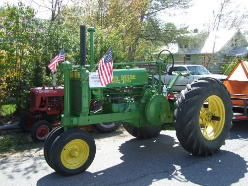 A cool old 1937 John Deere tractor towing a float whose purpose I could not discern:
