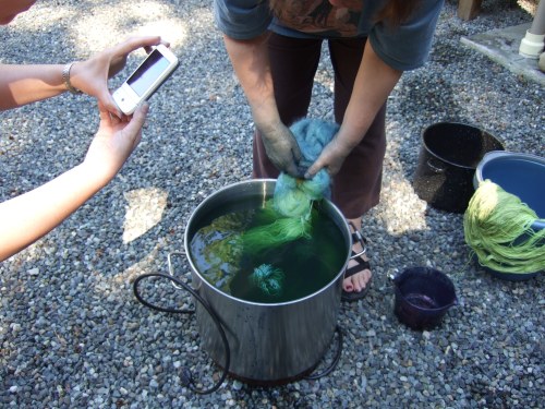 Judith always has some dyepots going at this event. Here is fiber turning blue as it comes out of an indigo bath and encounters oxygen: