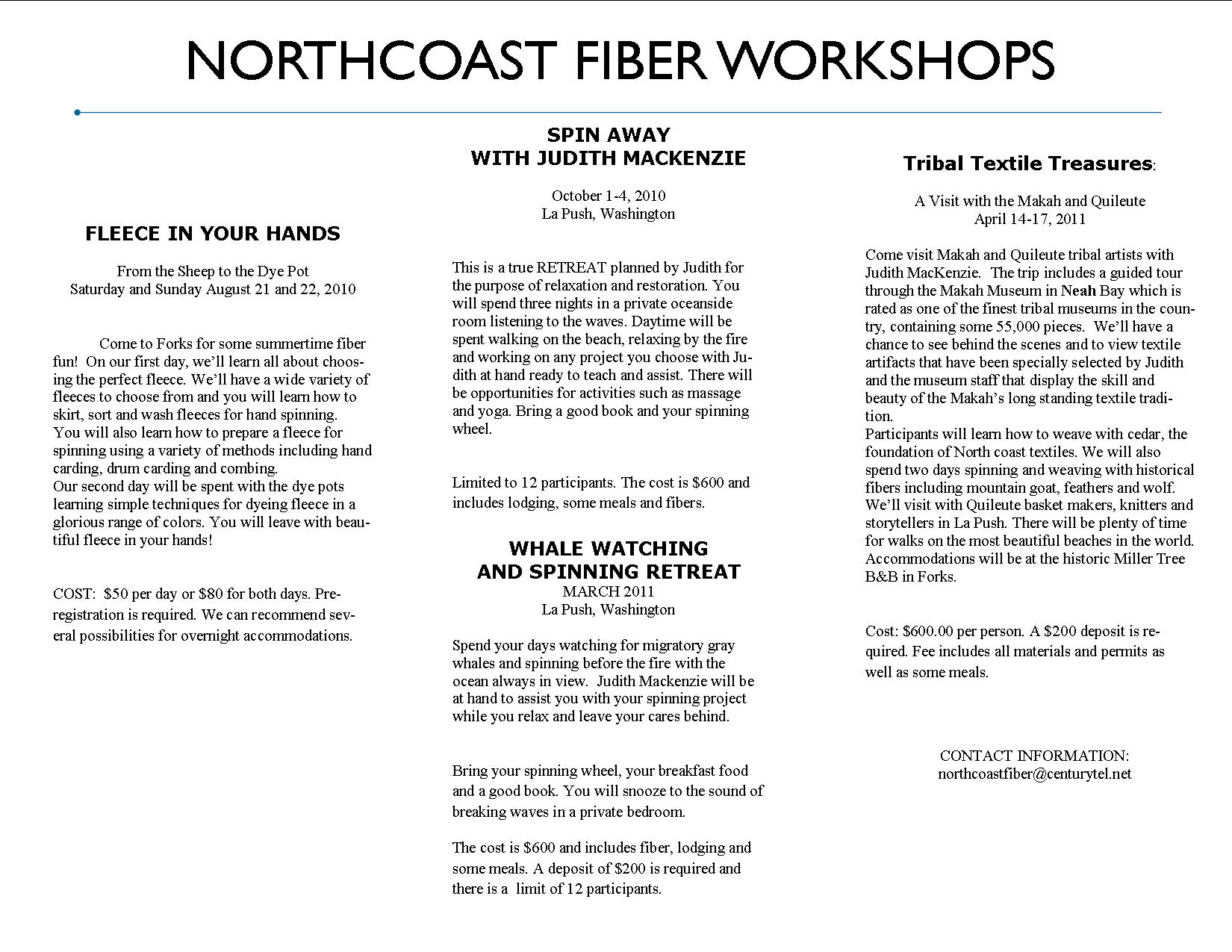 Judith will be teaching some workshops out in the Forks & LaPush areas in the coming year. They don’t seem to have a website yet but you can email northcoastfiber AT centurytel DOT net for more information. Or click the thumbnails below for the full size image of her workshop brochure (2010 through Spring 2011).