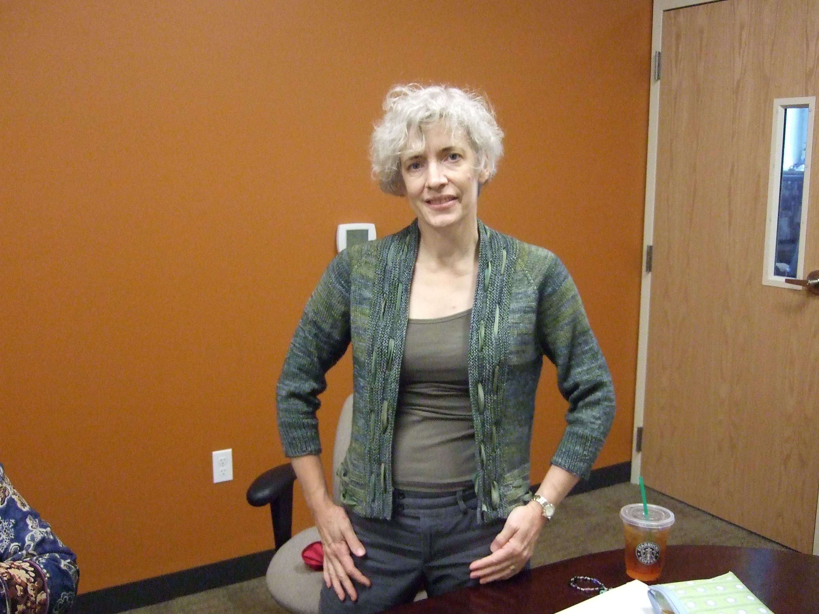 On Sunday I spent time with my knitting friends. The fineness of the day tempted some of the knitters to stay home and work in their gardens, so we were a small but happy group: