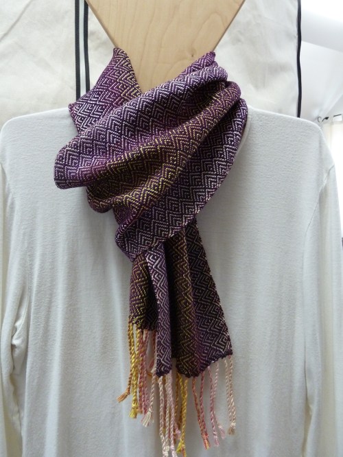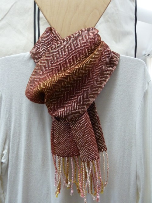As promised, here are pictures of the latest plaited twill scarves in the warp colorway “Sea Scallop”. For those of you who are not weavers, the warp is seen as the threads that run lengthwise through the scarf, and which you see in the twisted fringes at each end. The weft is the thread or yarn that is woven back and forth across the width of the scarf, forming the pattern. All of these were woven using the same tie-up (how the treadles are attached to the harnesses on the loom) but I used two different treadling patterns (the order in which the harnesses are lifted for each shot or pass of the weft) so that’s why you see two different patterns.