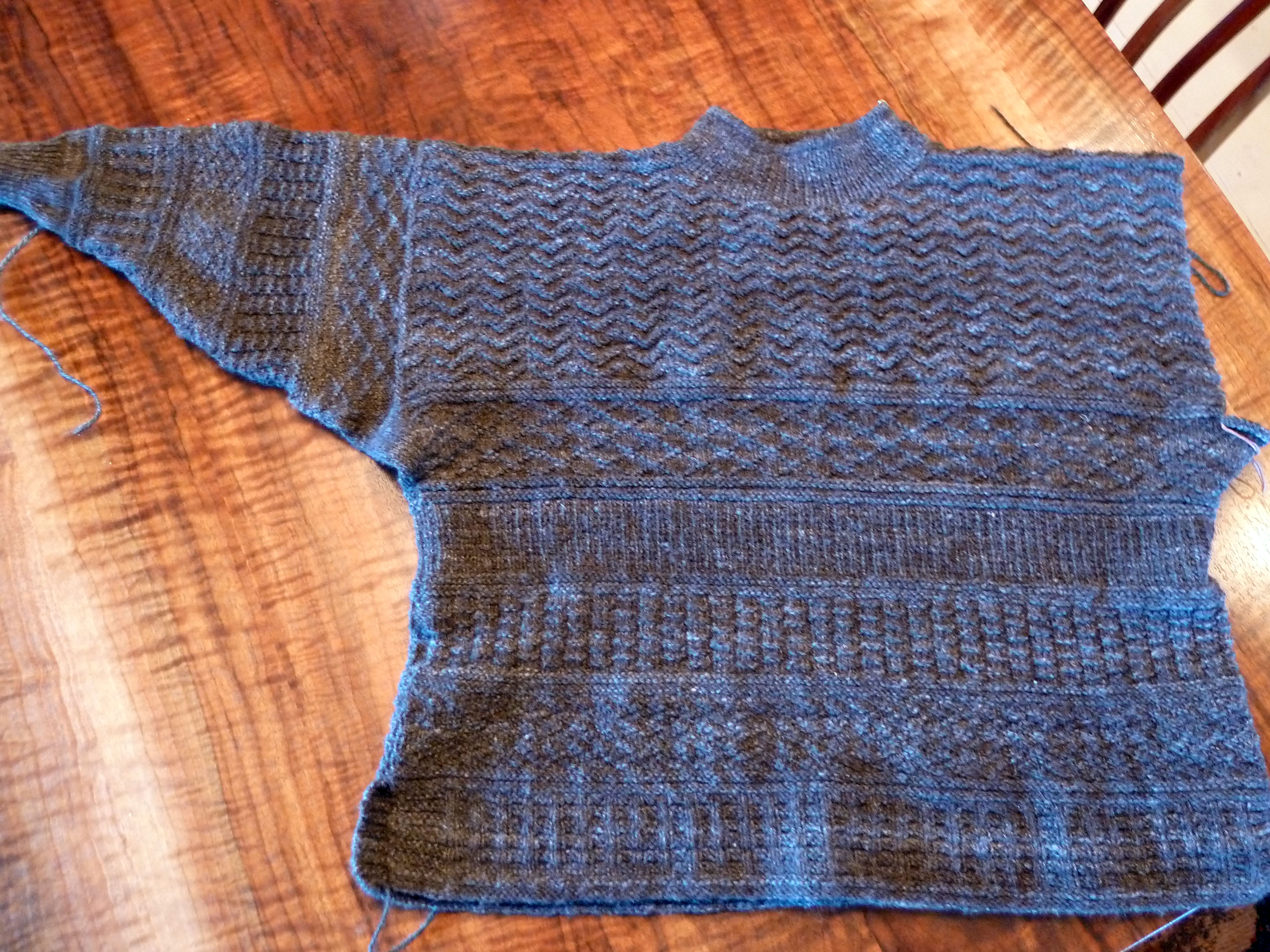 Anyway, after the first pattern band where you decrease away the underarm gusset, I continued with 3 of the body charts and the same 8 rows between them as in the body, making for double purl bands between patterns. Had to keep track of the decreases every 3 rows but that wasn’t so bad. Then finished with a short section of stockinette and the final ribbing. I was able to try it on to get the sleeve length just right for me, which is always nice.