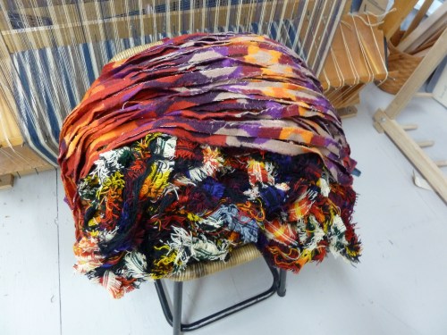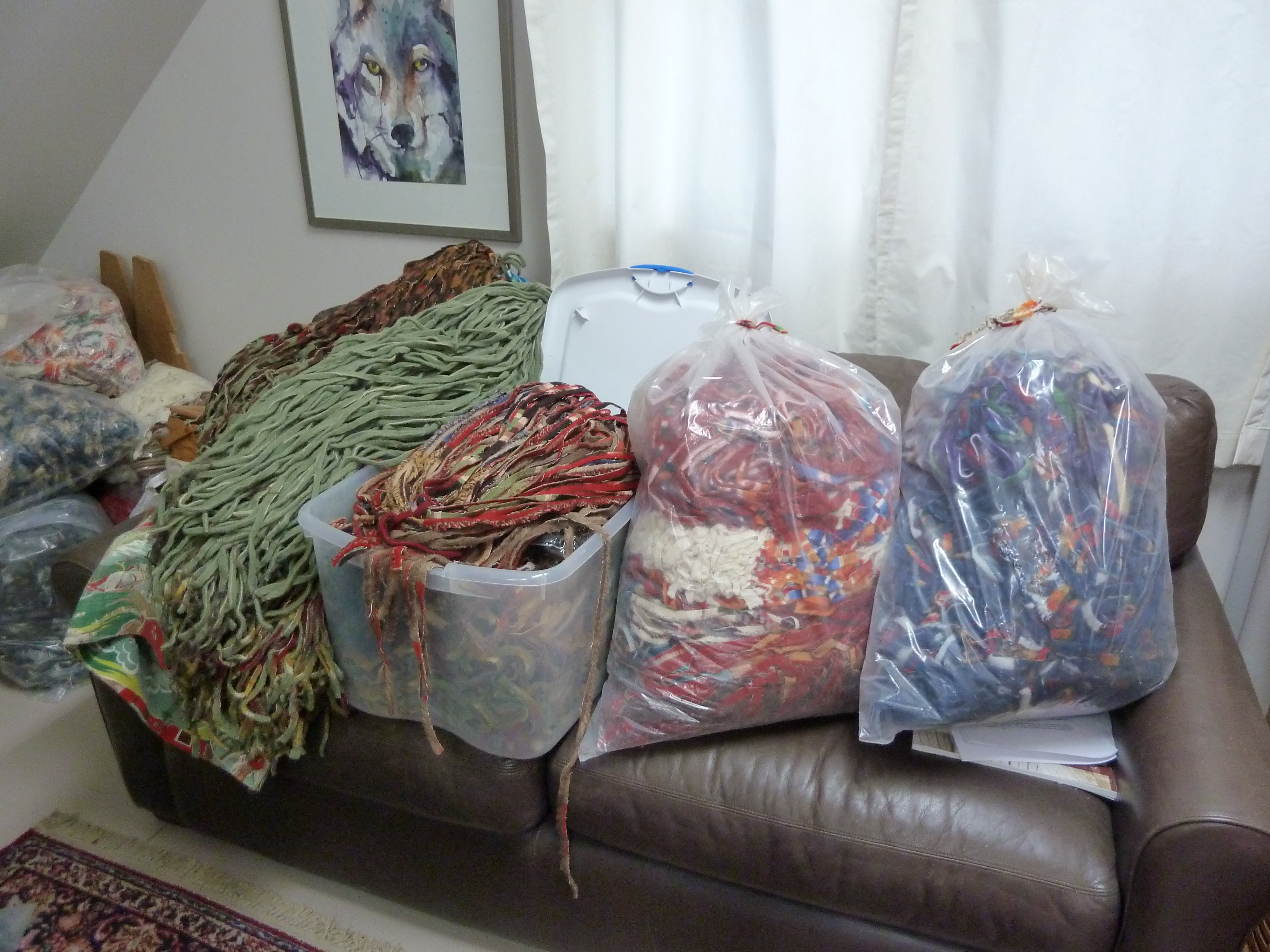 In the studio, I am back to weaving rugs on my big loom. I decided it was time to sort through all the bags of Pendleton “worms” I brought back from the mill outlet store in Portland. Bags and bags of them. When I buy these, they are dumped into a big bin, sold by the pound, so I basically go dumpster diving and stuff all the colors I like into big plastic bags. They still need to be sorted so I can see what and how much I have of various colors. It’s a dusty, dirty affair!
