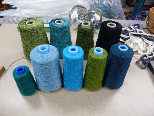 I’m also toying with the idea of making one more run of the plaited twill scarves. The Confluence Gallery sold almost everything I had over the holidays, plus 3 of my lap robes (not complaining, mind you…) So now I am almost out of scarves again. I don’t want to buy more material, though, so am trying to figure out what I have enough of to make a long-ish warp. Warp colors in the foreground, some rayon chenilles to weave with in the background: