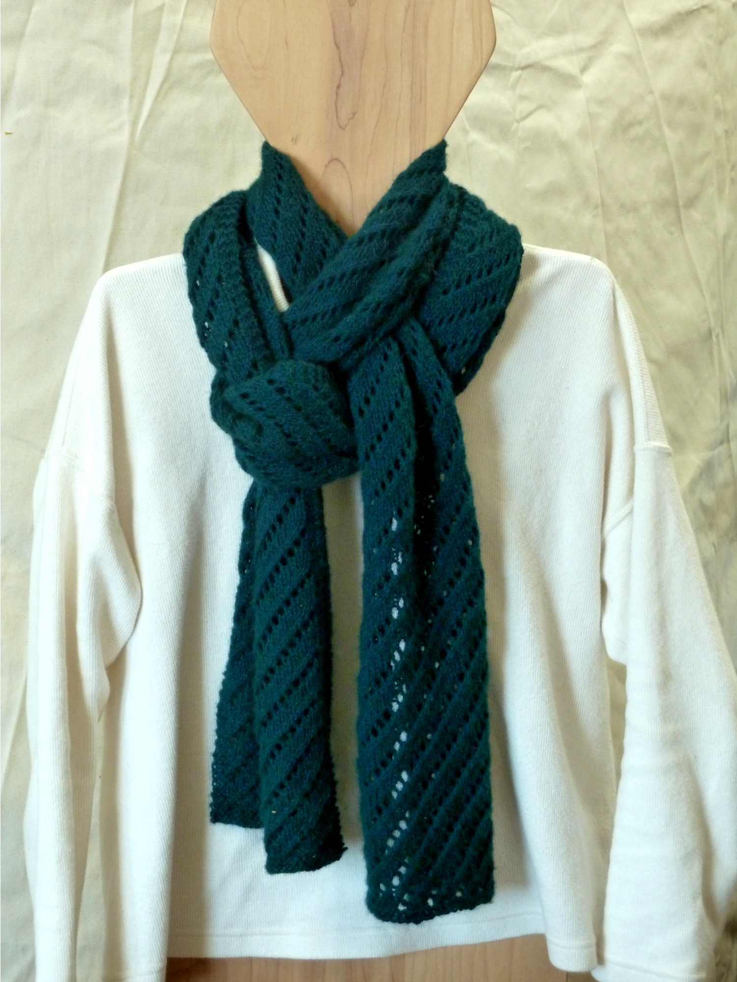 Here are some pictures of the bison/merino scarf I finished a few weeks ago. It is just so yummy and warm. The pattern is “Diagonal Lace Scarf & Wrap” from Churchmouse Classics. It is an easy knit (just an 8-row repeat) but also not boring. I used 2 skeins of Buffalo Gals 70% bison/30% merino (dyed by Judith MacKenzie, and probably no longer available) so a total of about 520 yds to make the sport-weight scarf version of this pattern.