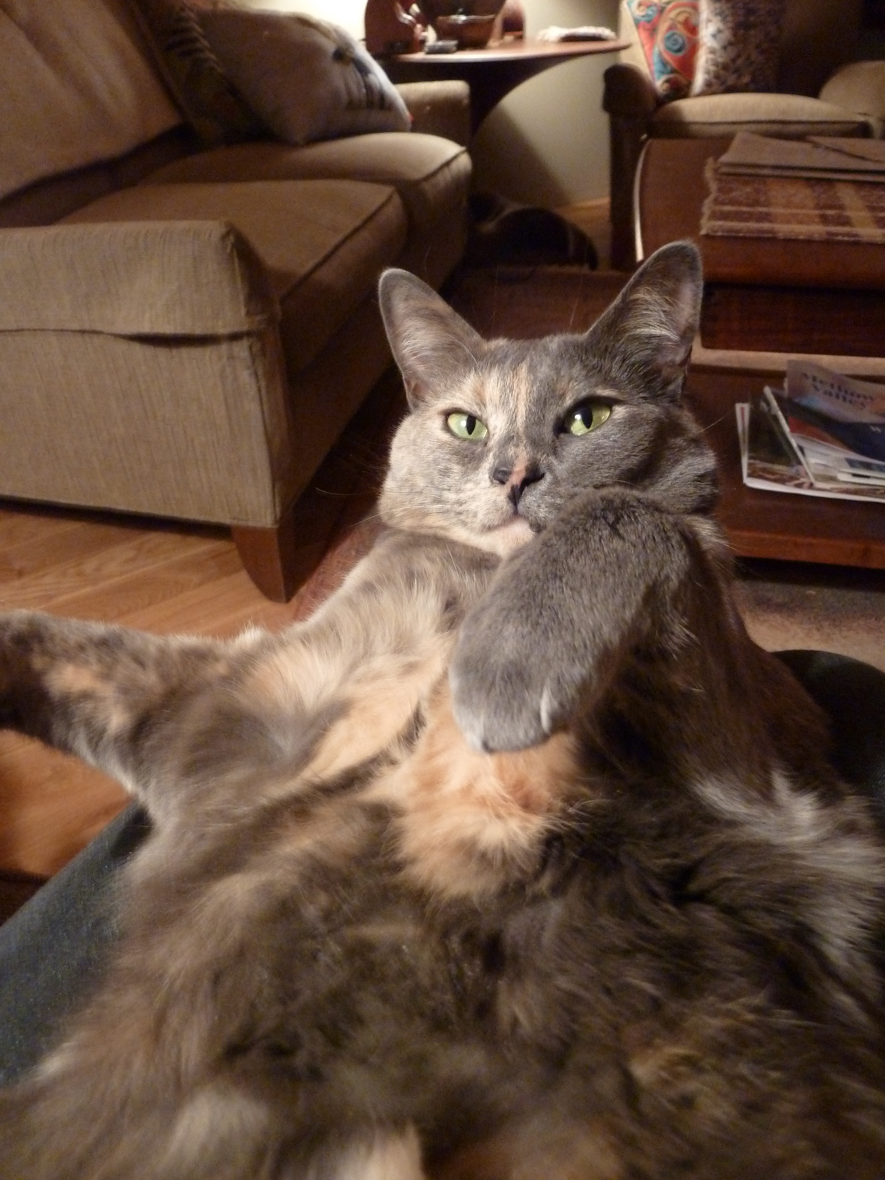 The cats just love the fireplace insert in the evening. It has a fan that blows hot air into the living room, and we have a footstool set up in front of it for their lounging: