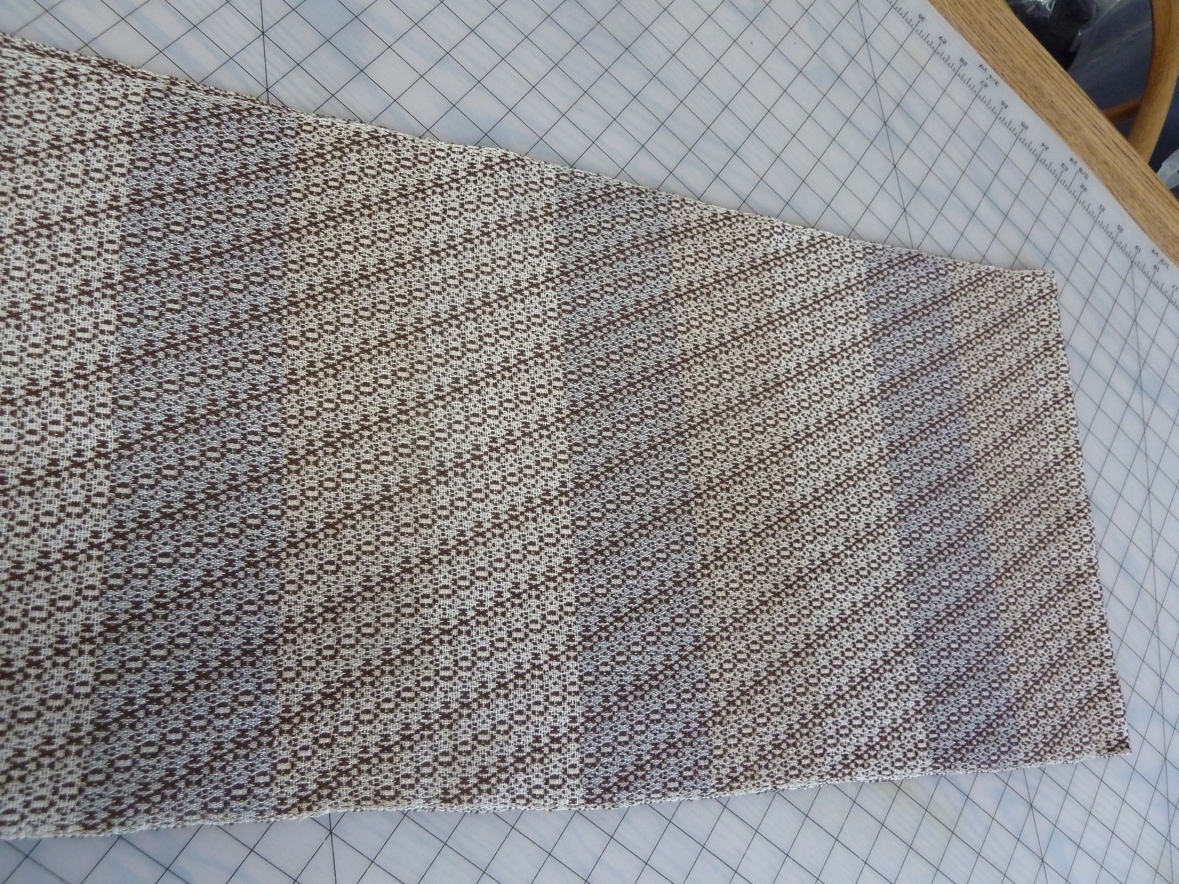 You could do this with a narrower scarf as well, and any kind of shawl or scarf – not just handwoven. I also tried putting it on with the bias fold up against my neck and the crossed edges hanging below towards my shoulder blades. You can make a kind of “shawl collar” this way, and the ends still hang down straight in front. So play around with it and see what you think!