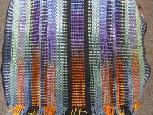 Here is a shawl woven by a former student/customer, using one of her tencel hand-painted warps (color changes along the length of the pre-wound warp) combined with black stripes and other stripes using a warp wound from hand-painted yarn (color changes around the skein and is more homogenous when wound into a warp).