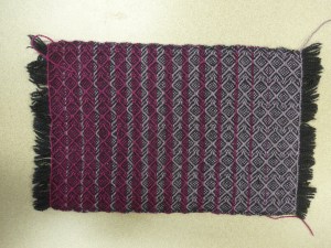 This was a 3-day workshop organized by the Seattle Weavers’ Guild and held at the Nordic Heritage Museum in Ballard (a neighborhood in north Seattle). It was with Kathrin Weber from North Carolina, a professional weaver and dyer since the 1970’s. More recently she has been teaching a lot and selling her hand-painted warps through her website and Facebook page (Blazing Shuttles). All of her warps are cellulose fibers. This particular workshop was called “Focus on the Warp” and was about how to use hand-painted warps in an intuitive manner, composing on the loom – it did not include dyeing.