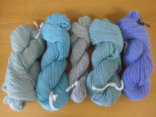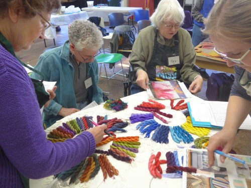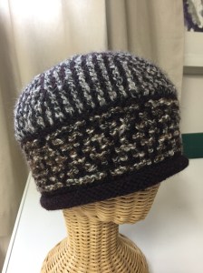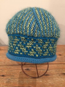 I have sold several of my Mosaic Mojo hat patterns recently (on Ravelry and hard copies at Winthrop Gallery) and it reminded me to post some pictures. Over the last few months I had spun up a number of small carded batts from a carding class I took years ago. I plied them together in different combinations and wound up with small amounts of yarn in a variety of colors. Since we can only sell knitted items at our annual guild sale that incorporate handspun yarn, this is what they were used for. The ones below have handspun for the variegated yarn, and Cascade 220 wool for the solid color.