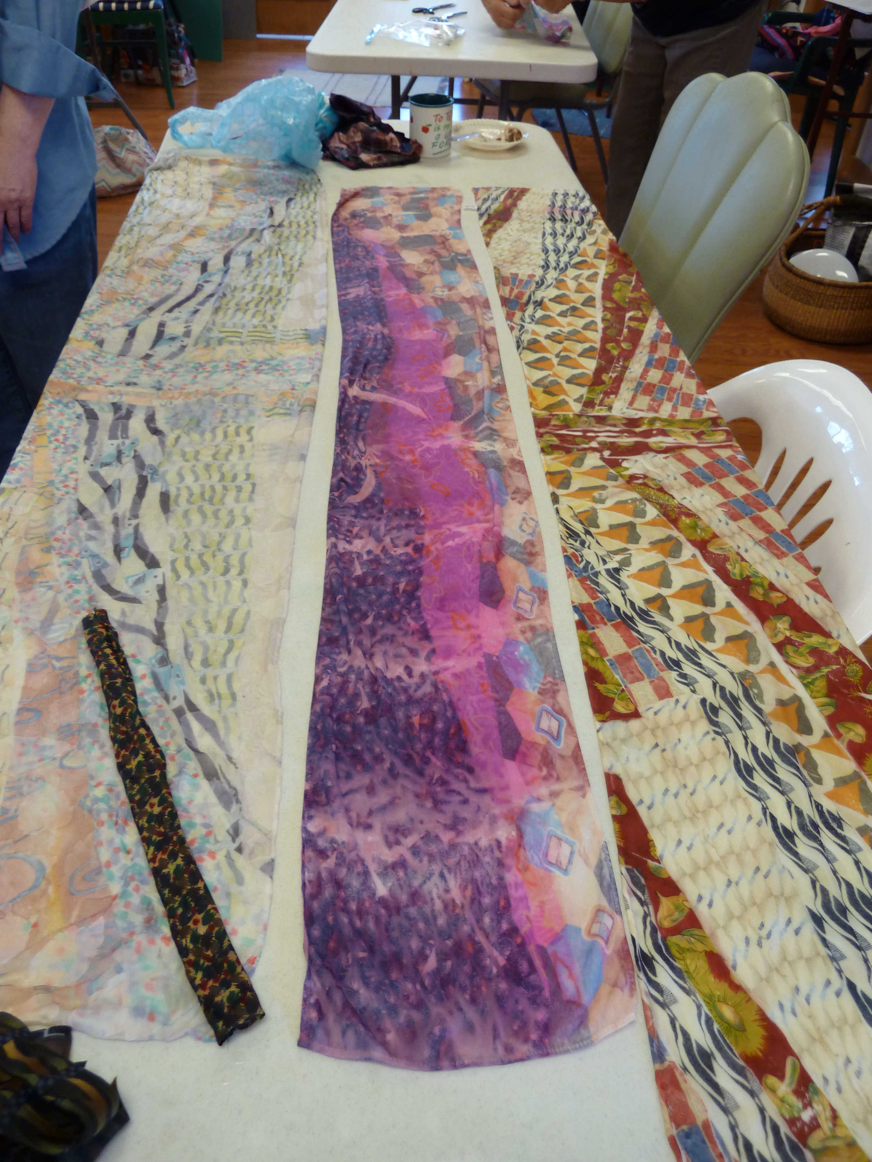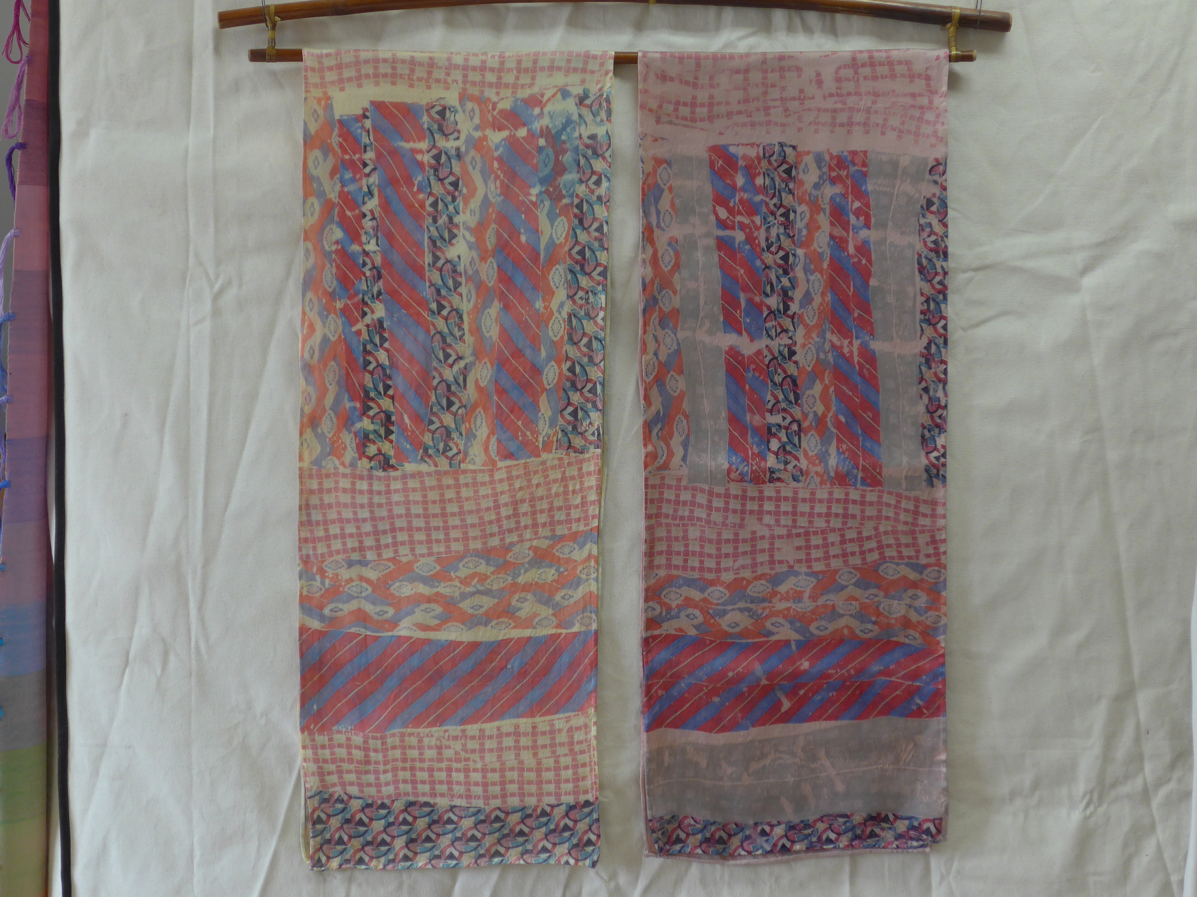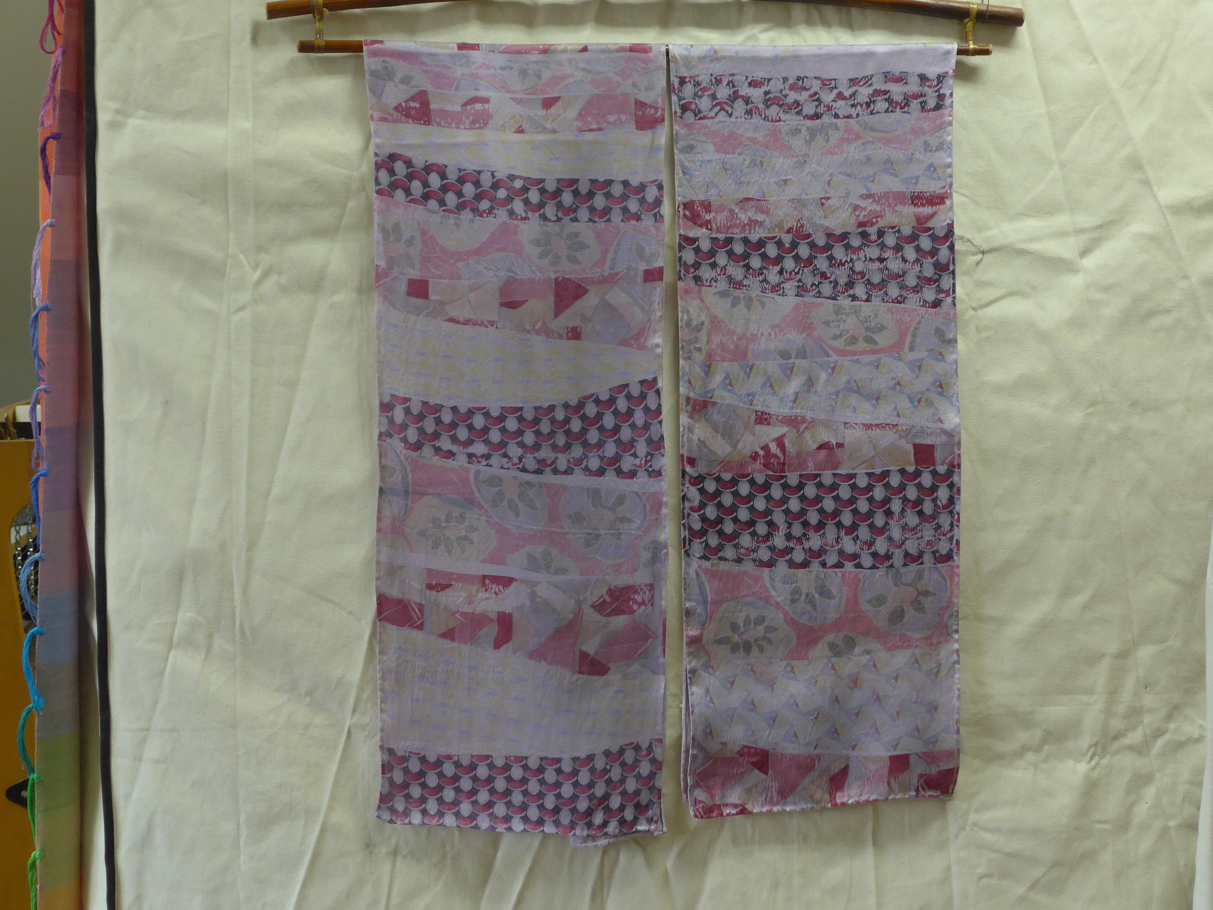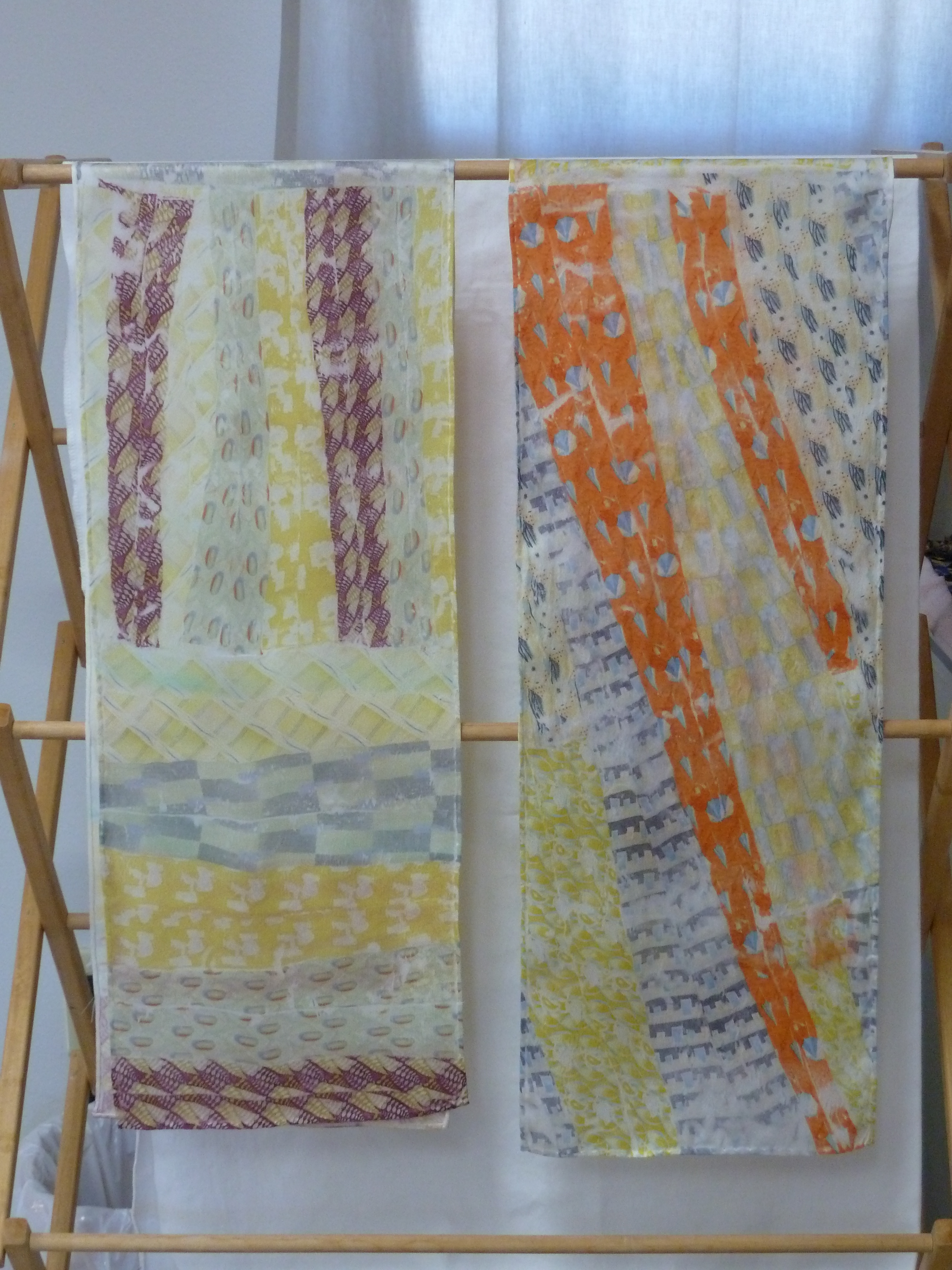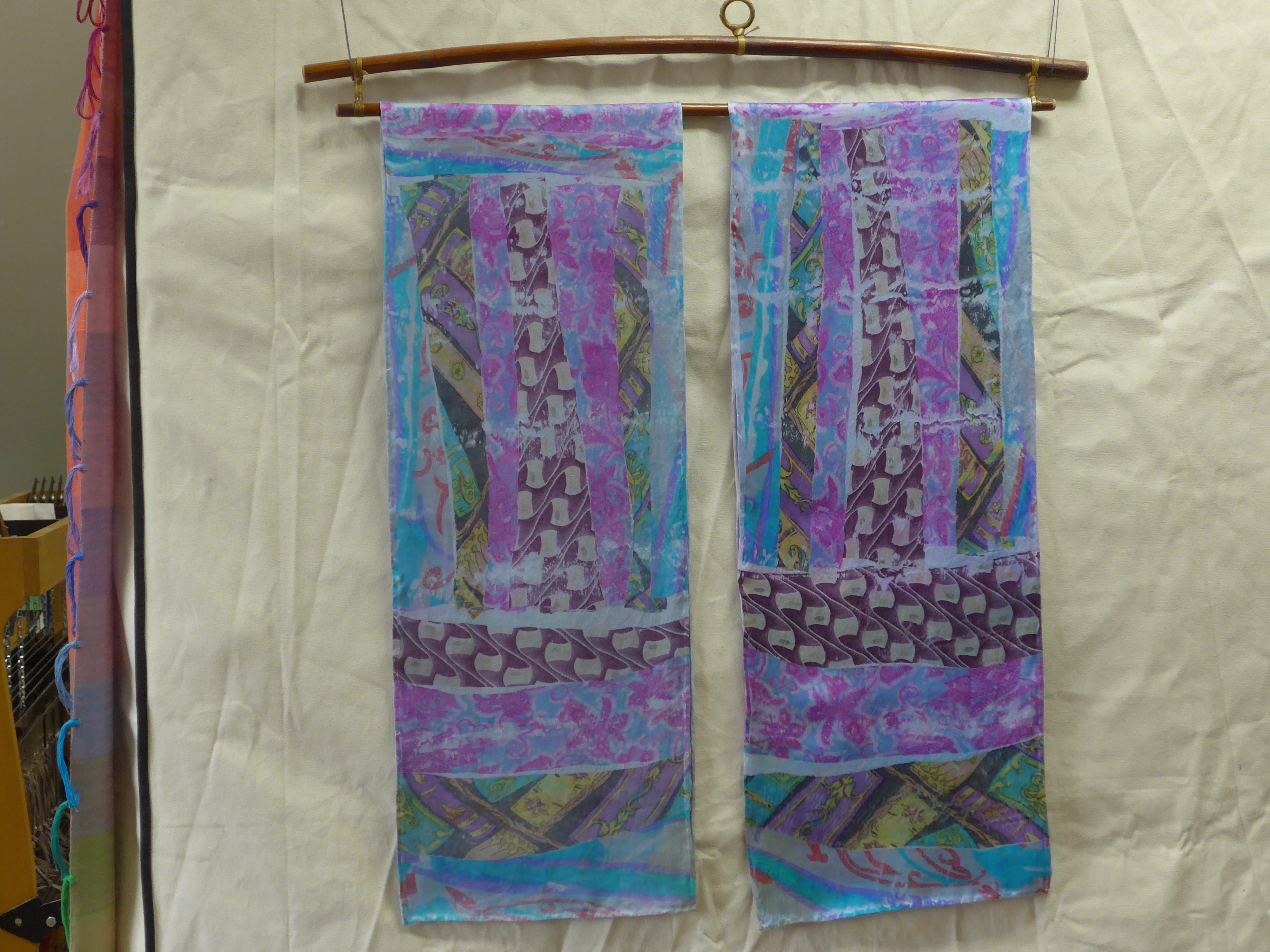 Here are a few of the sample pieces she brought to show us. She uses silk yarns for the most part, and Lanaset acid dyes. All of these were woven on a single painted warp (not combined warps); some have surface design elements which she teaches in another workshop called “The Esoteric Cloth”.