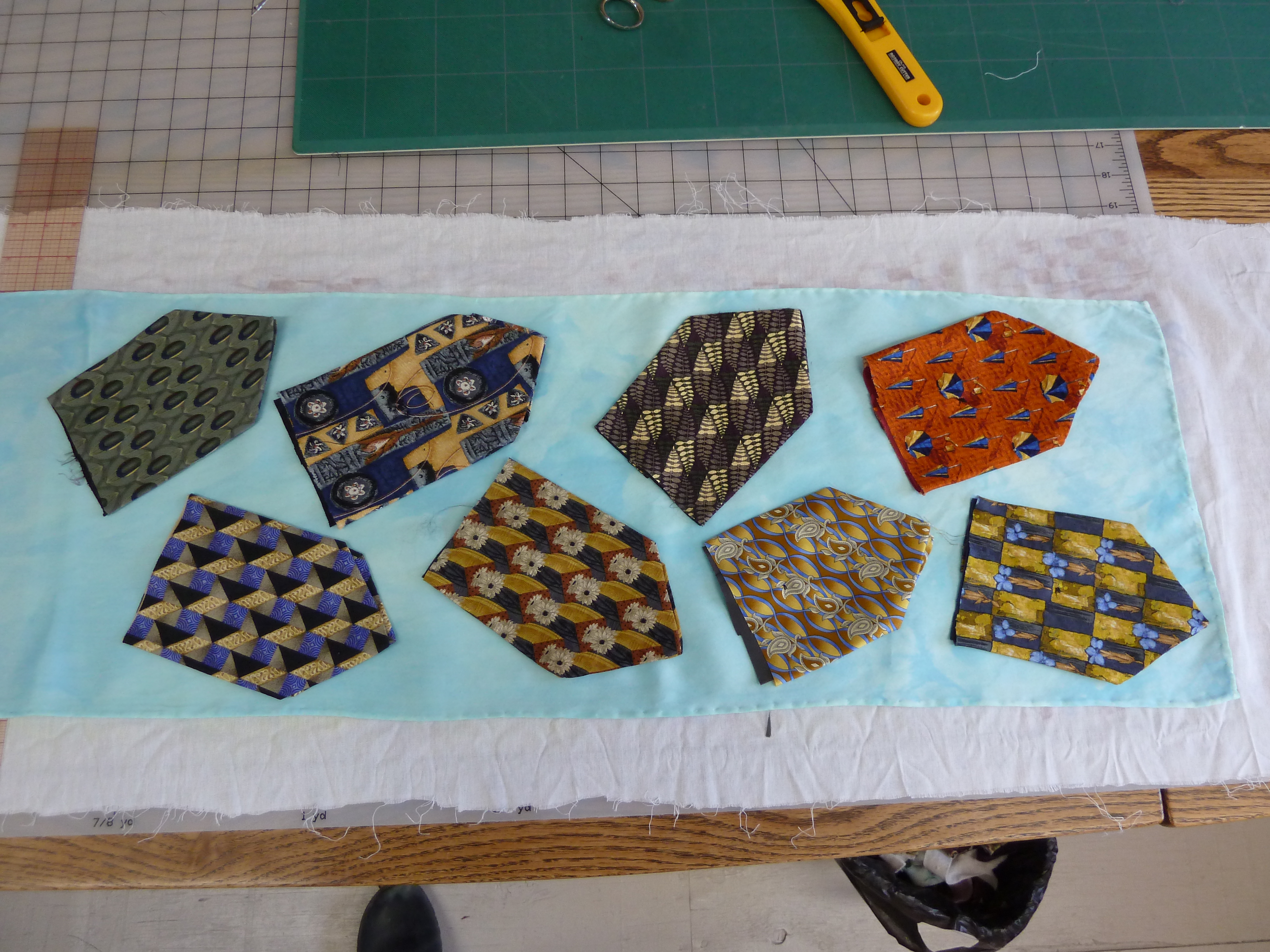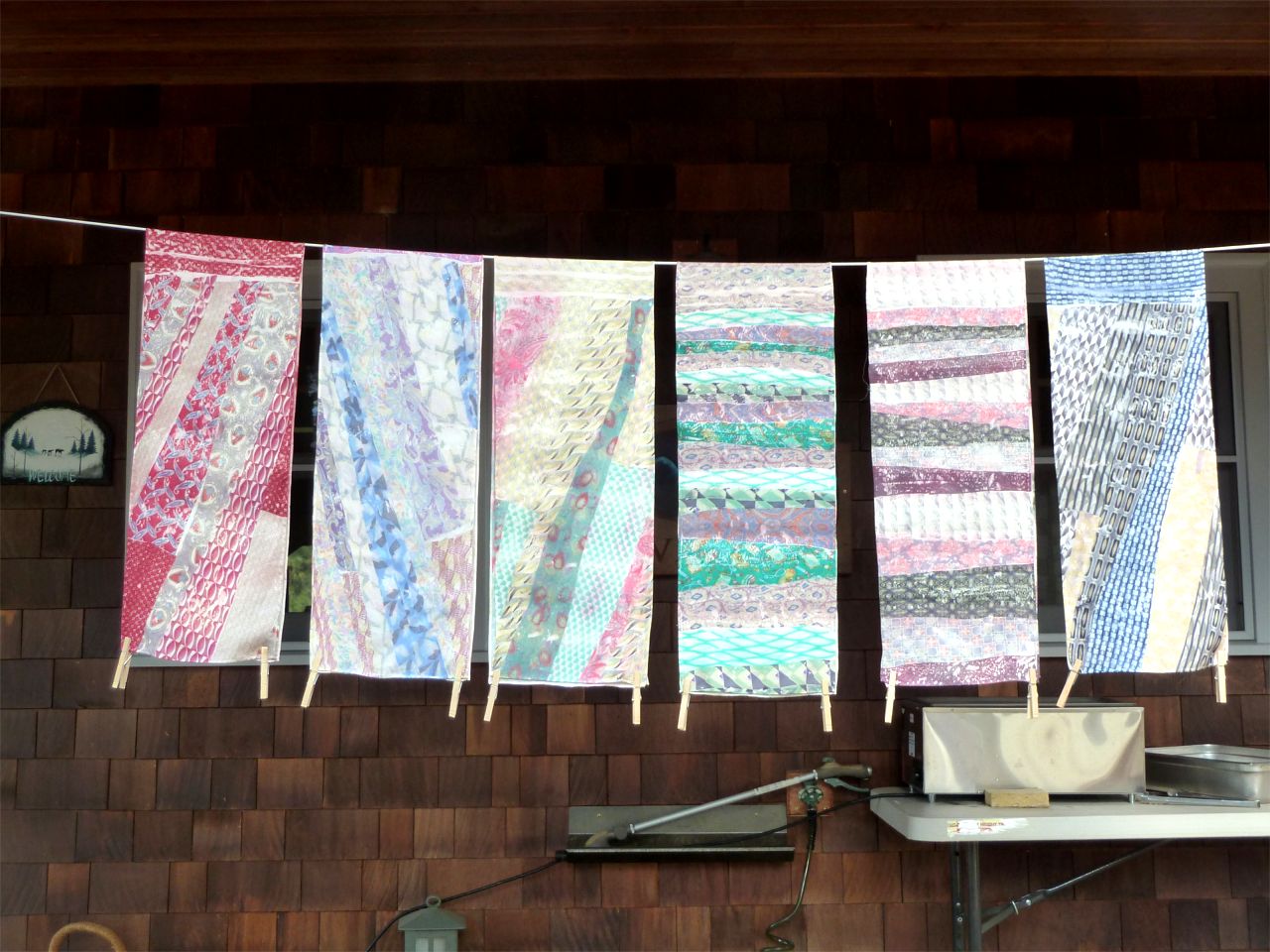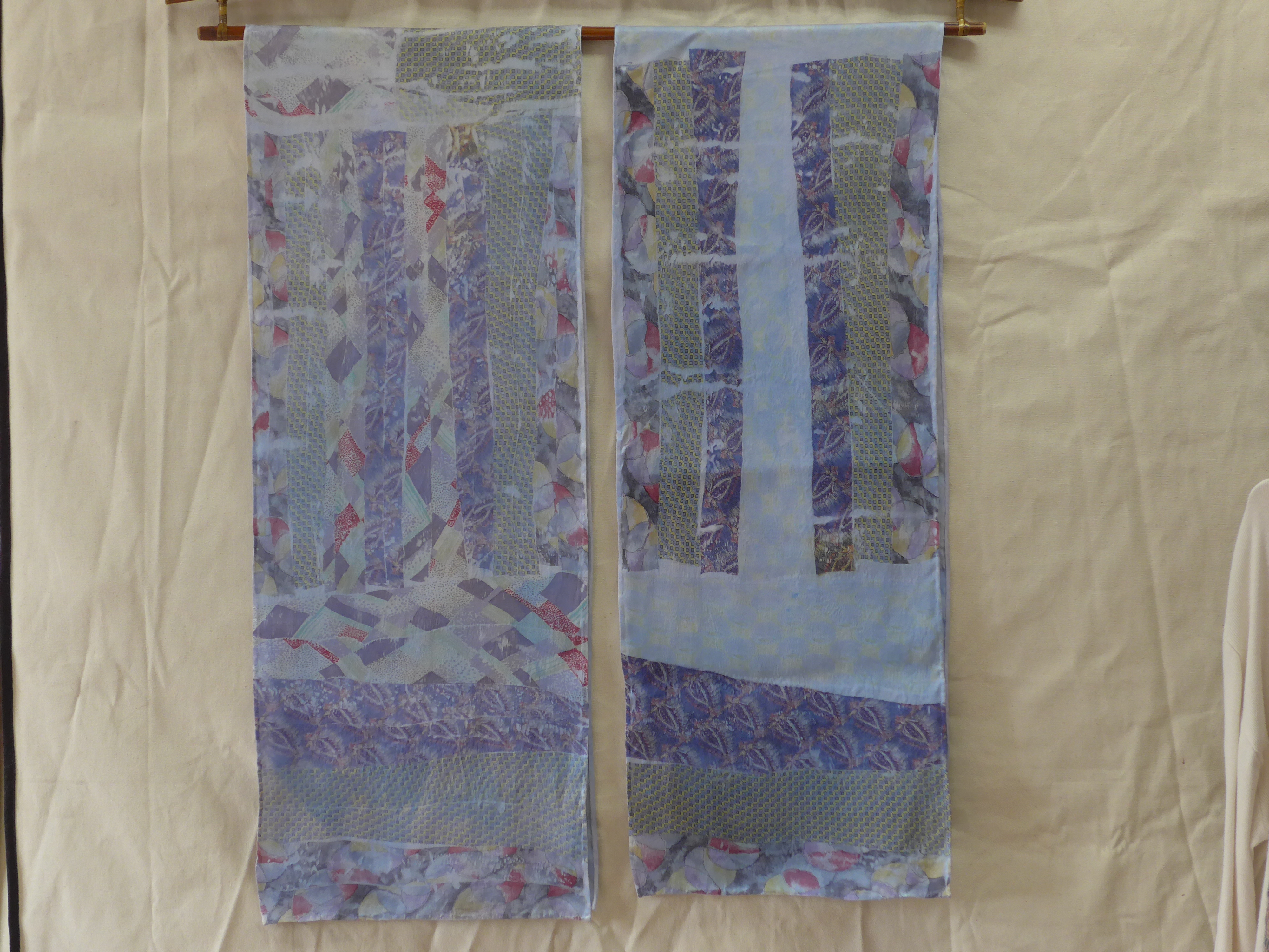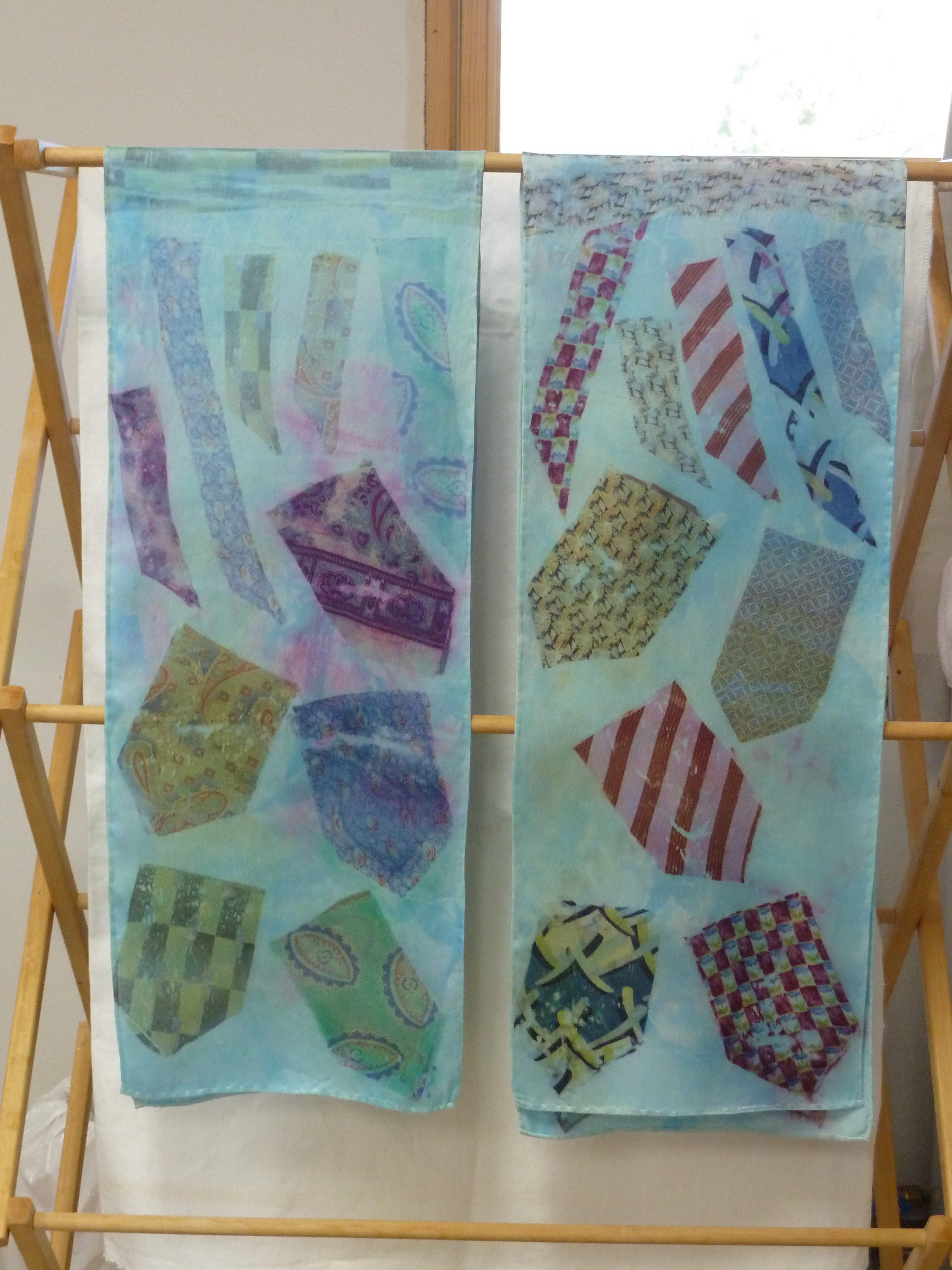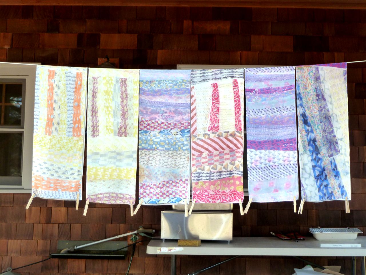 Here are a few of the sample pieces she brought to show us. She uses silk yarns for the most part, and Lanaset acid dyes. All of these were woven on a single painted warp (not combined warps); some have surface design elements which she teaches in another workshop called “The Esoteric Cloth”.