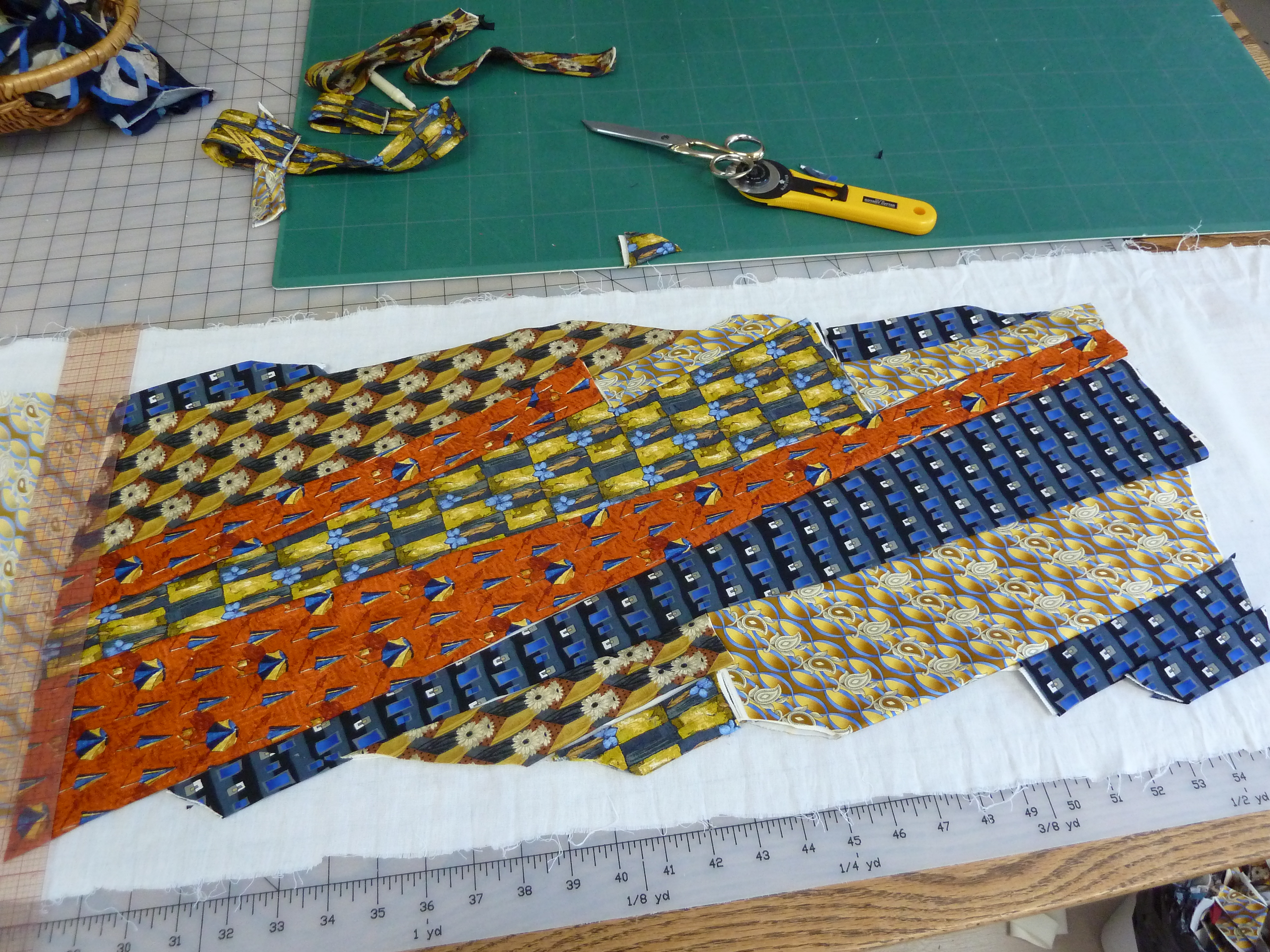 The second day, she had us borrow other people’s colors from the day before, mix things up, just go for color without using formulas and planning. Yikes! But we also had more time, so I was able to divide my warp into lengthwise strips and paint each of them with the same colors, but offset. I have a thinner blue-black border with shifted color down the middle. The weft is a reddish purple.
