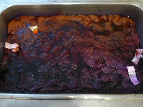 Once painted, they were rolled up in the underlying plastic wrap, placed in a large ziploc bag, and steamed for 20-30 minutes. There is no way to spread it out again once it is done, so I guess I won’t really know how this turned out until I put the warp on a loom and weave it! We also painted the dye onto the skein of weft yarn, and steamed that. My weft for this first warp is a dark navy blue.