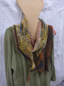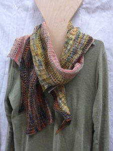 and the 9 scarves that were woven using a variety of DK weight handknitting yarns and rayon chenilles. These are all out at the Confluence Gallery in Twisp and the Winthrop Gallery. There was a 10th scarf at the end of the warp that came out shorter (about 54″ not including the fringe) and I am keeping that one. It was woven with Elspeth Lavold Baby Llama, and is quite yummy feeling