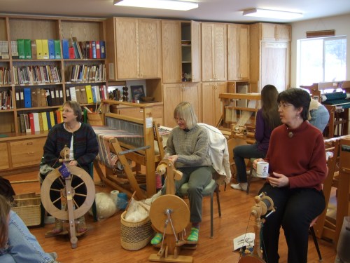 Thursday was the opening day for the Okanogan County Fair over in Omak. A group from our guild, Methow Valley Spinners & Weavers, had organized a “fleece to shawl” event. We had a loom already warped for a shawl with handspun yarn that several of us had supplied. We brought a washed fleece, a natural colored Romney from The Pines Farm in Maple Valley (south of Seattle). We hand-carded the fleece, spun the rolags into singles, then I was the “designated plyer” and made a 2-ply yarn. This was handed off to the weavers, who wove the shawl. We actually finished it in about 5 hours – I was amazed! Thursday was also the day that a lot of school groups came through, and the kids were really interested and asked a lot of questions.