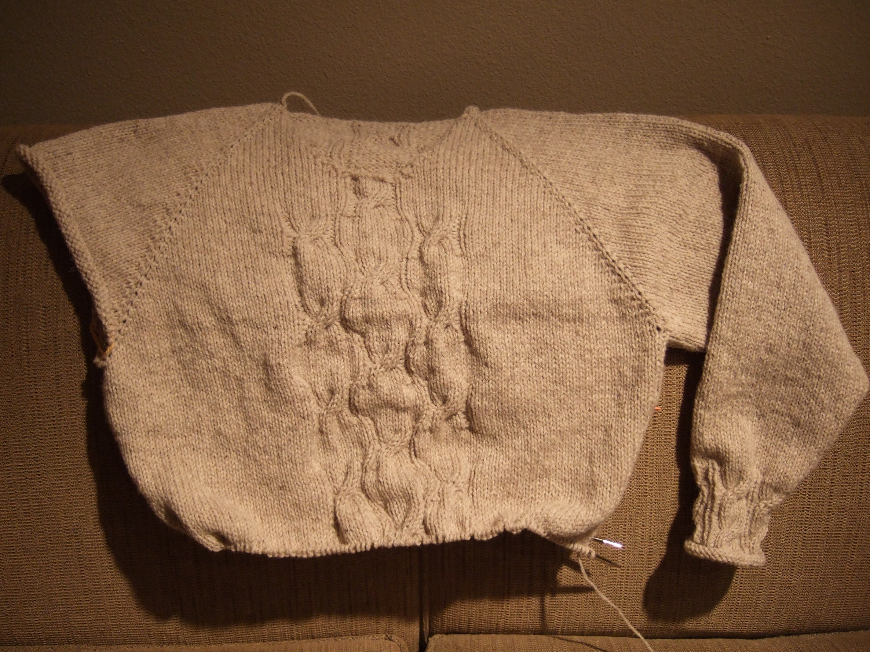 In anticipation of the upcoming Okanogan County Fair, and also a new round of teaching the top-down raglan sweater class, I finally got the little cardigan finished that I knit over the summer. I still needed to darn in the ends, sew on the buttons, and block it. It was knit using Rowan Yorkshire Tweed (about 7 sts/in), which sadly is a discontinued yarn. I only had so much of the main color and couldn’t find more anywhere, so I had to get creative towards the end. It is knit in one piece from the top down, and for the borders I used a mosaic pattern called “Sanquar Check” from one of the Barbara Walker books (1st Treasury of Stitch Patterns I think, am too lazy to go out to the studio and check…) I had to go with 3/4 length sleeves due to the running-out-of-yarn problem, but I think I actually like them that way. So, finished object: