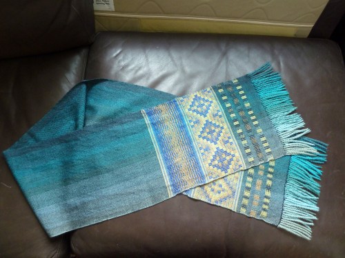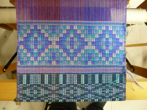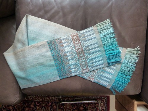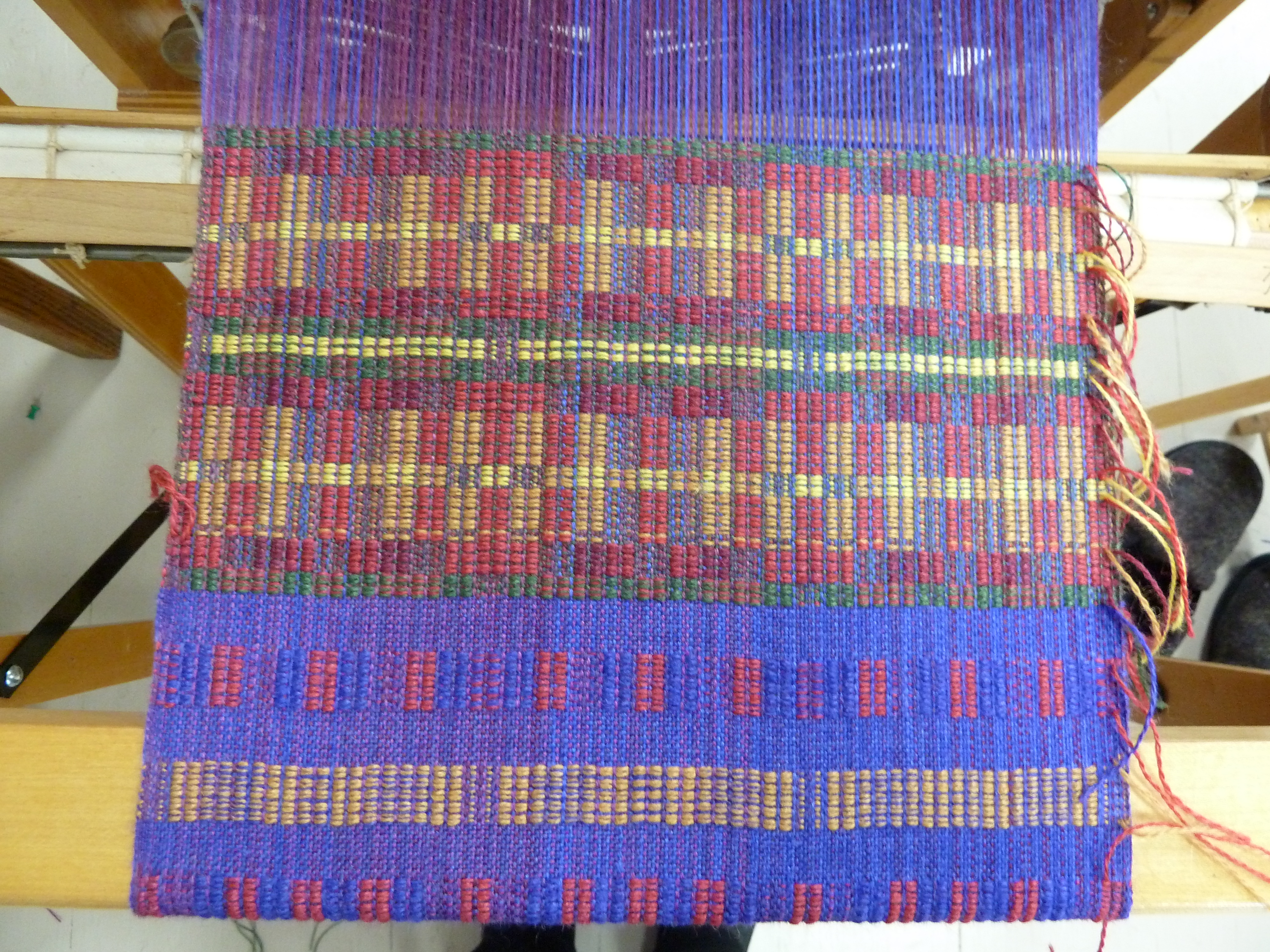 While working on these, I was getting increasingly frustrated by trying to use my little loom (a “Baby Mac”, Macomber model CP folding portable) for serious work. It is great for taking to workshops, fits in the back of my Honda CR-V, and it actually works great. But the treadles are small and spaced close together, it does have a tendency to have the tie-up hooks pop off on a regular basis, and this time around one of the folding struts folded up on me and I didn’t figure out why the tension was so far off on one side until it was too late. I thought I had just done a poor job putting the warp on.