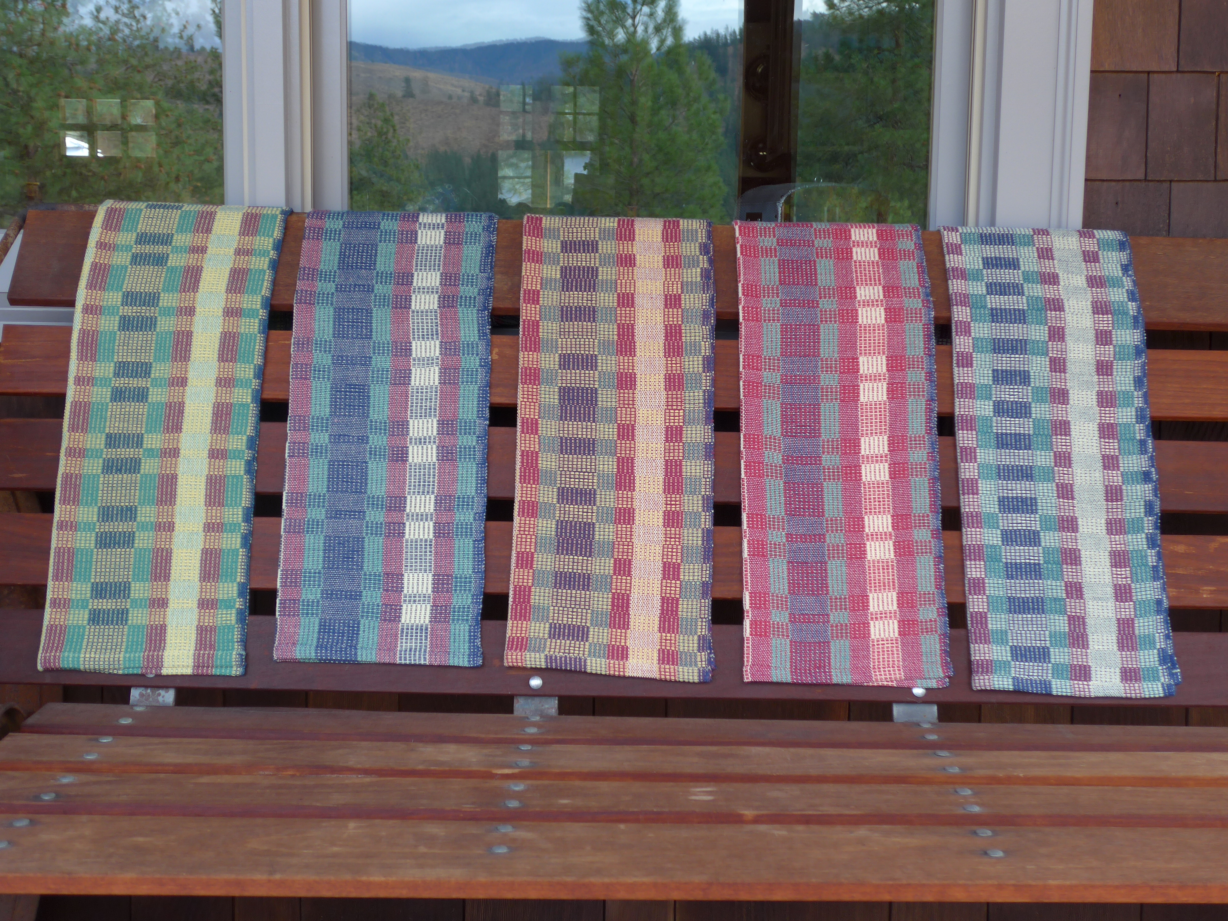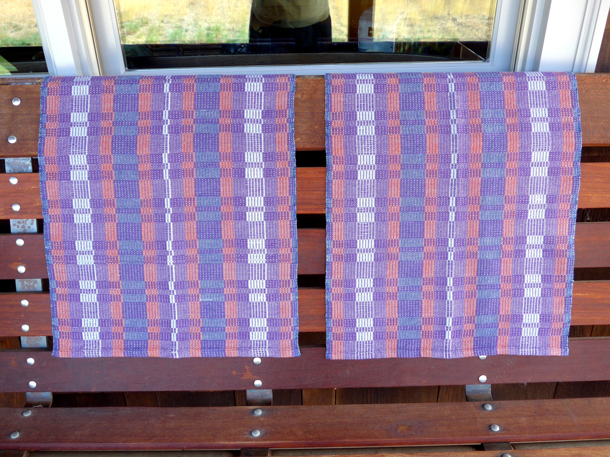 Last week I wound and tied on a second towel warp in a different colorway, and have been weaving away on those: