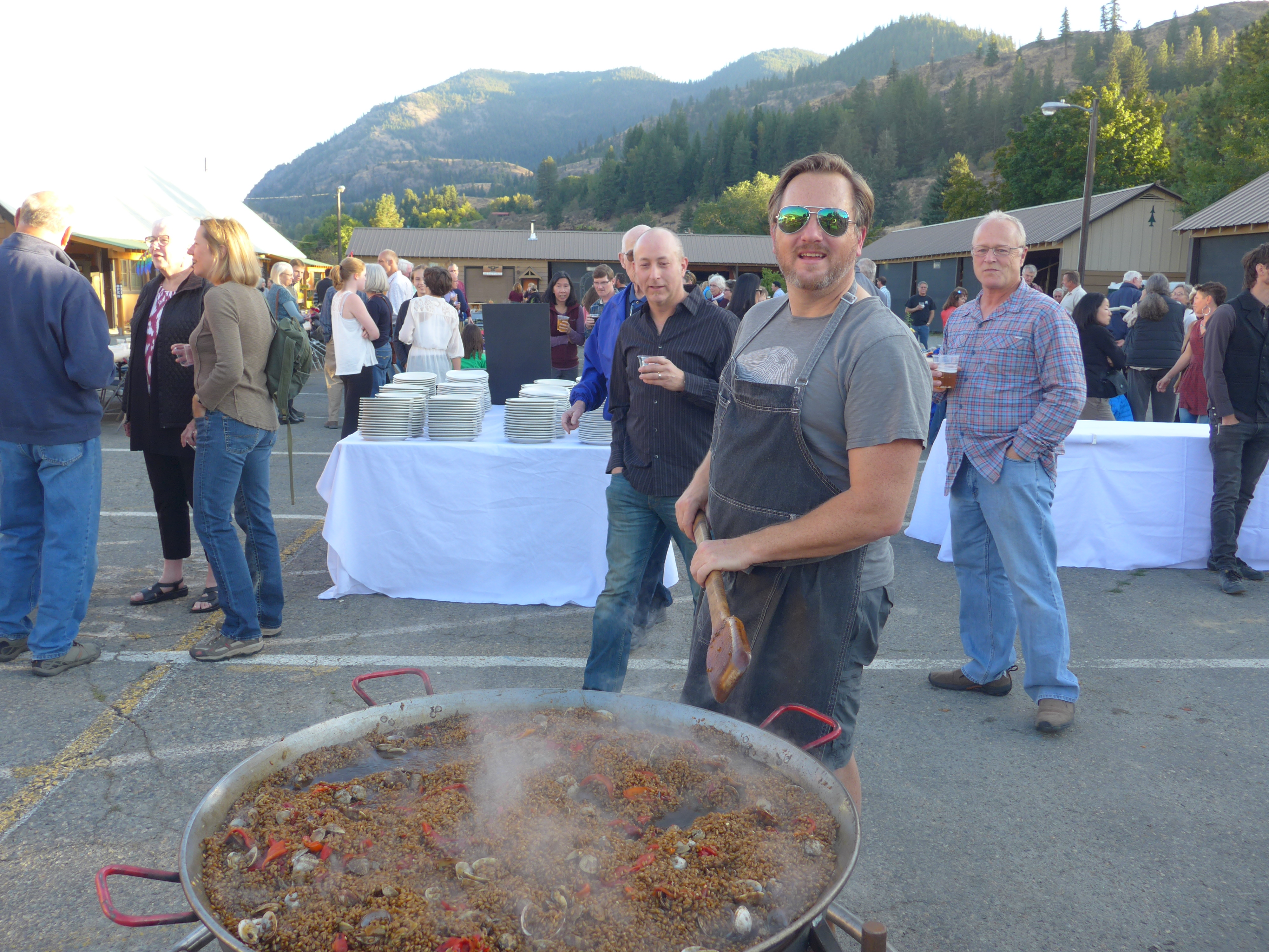 The paella dinner was designed by Cameron Green (she is a local chef and caterer). John Sundstrom of Lark restaurant in Seattle, one of Bluebird Grain Farms’ earliest customers, came over for the event and prepared his signature seafood paella dish. There were three huge paella pans going over wood fired outdoor cookers, plus several salads, bread, desserts, and a no-host bar featuring local beer and wine. Almost all of the food was sourced from local farmers, bakeries, coffee roasters, etc. and some of the proceeds went to support the Methow Made program (in 2013, TwispWorks started Methow Made as a collaborative marketing program to help Methow Valley food and beverage producers reach new customers).