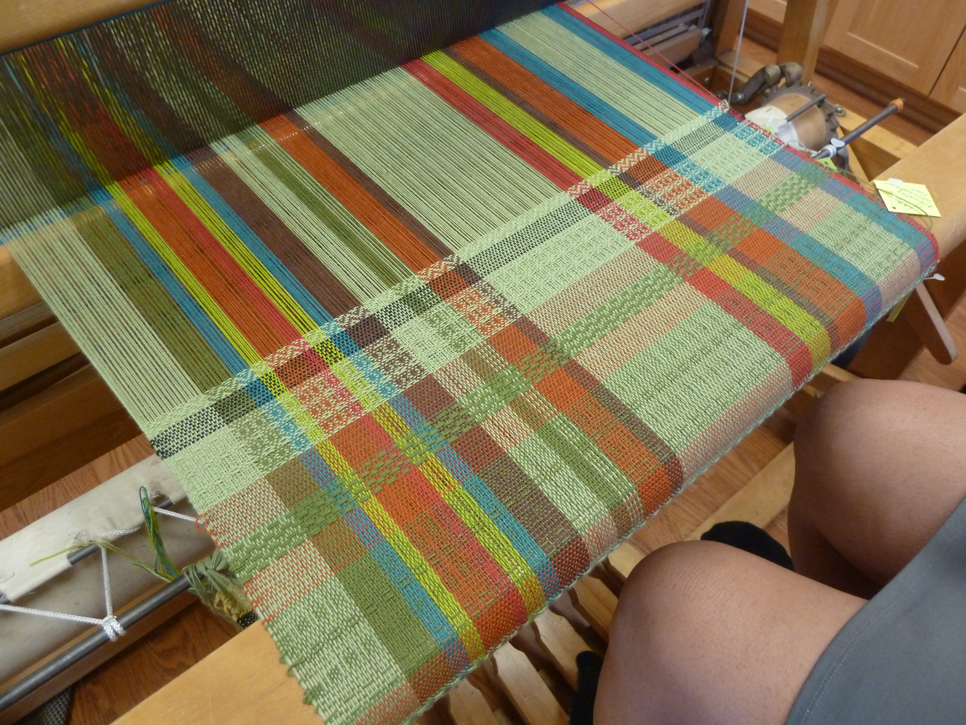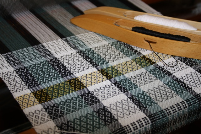 I had 12 yards on the sectional beam at the 40″ width, so when the extra 4″ on each side ran out, I was back to 32″ wide for the rest I have woven to date: