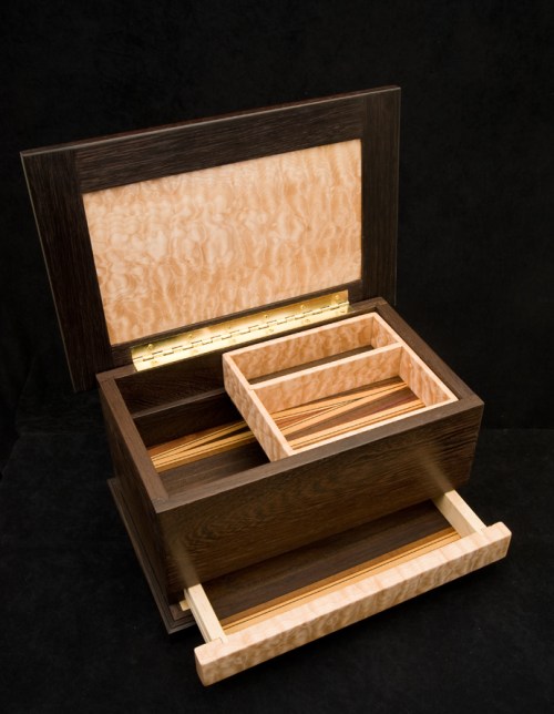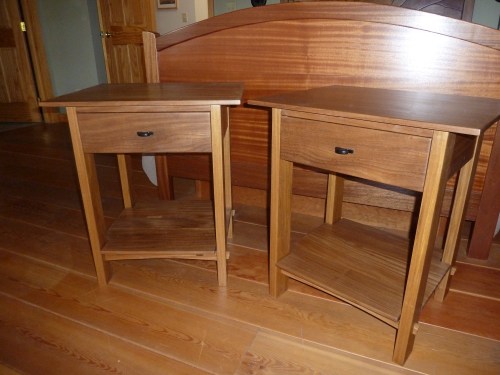He is feeling great and back to work in the shop. First up were 3 sets of bedside tables, two of them in cherry with ebony handles (one was an order, the other he did on “spec” to put out in the galleries) – the third set he did in afromosia for us! They are gorgeous: