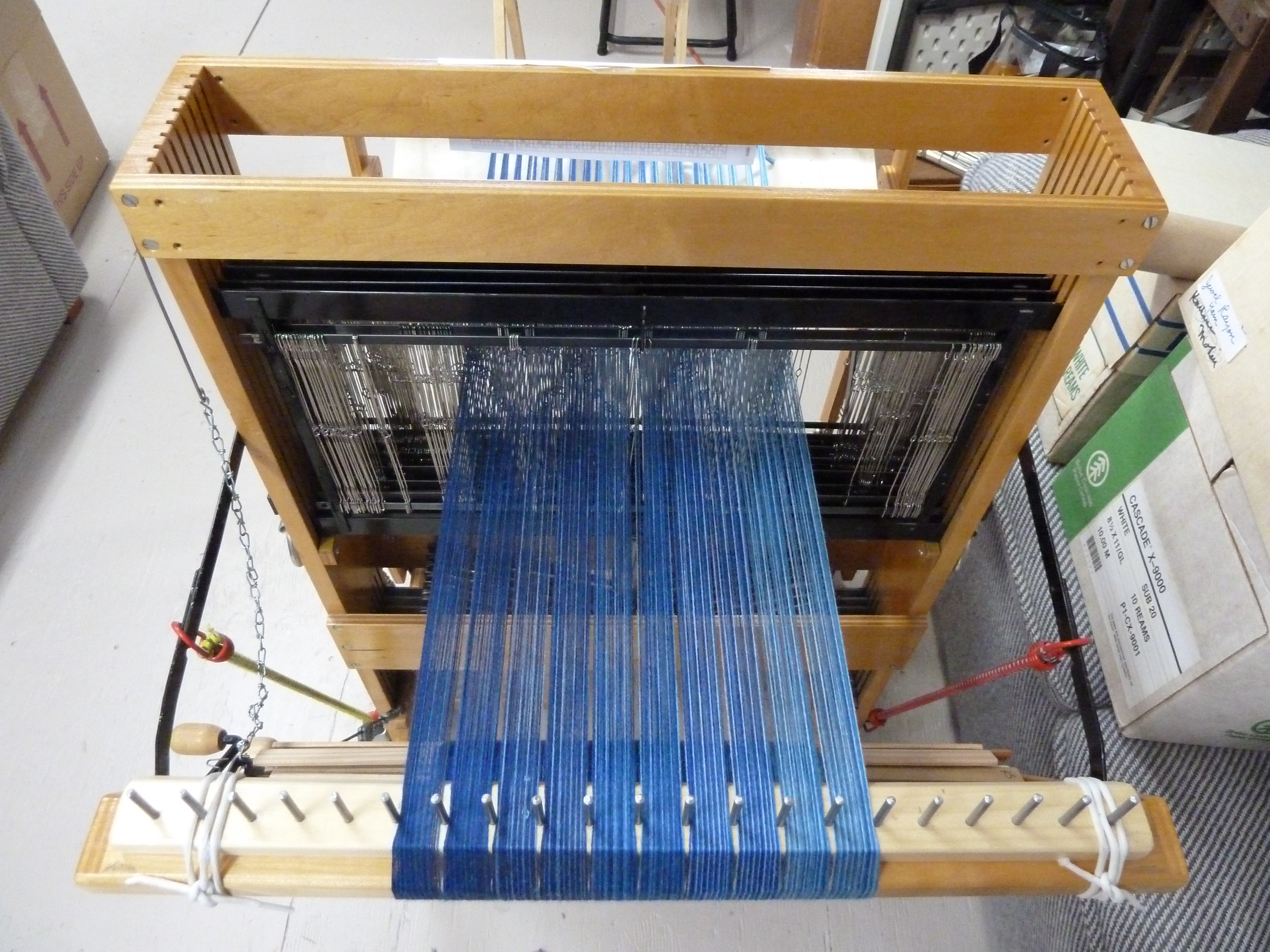 Meanwhile I have kept moving new weaving projects forward. I finished off the plaited twill scarves down at the weaving guild room and finally removed that warp setup from the loom. One of the other women in the guild is going to use my loom for a 12-harness project, then I will figure out what to do on it next. At home, I set up another warp for the polychrome summer & winter series, this time in shades of blue: